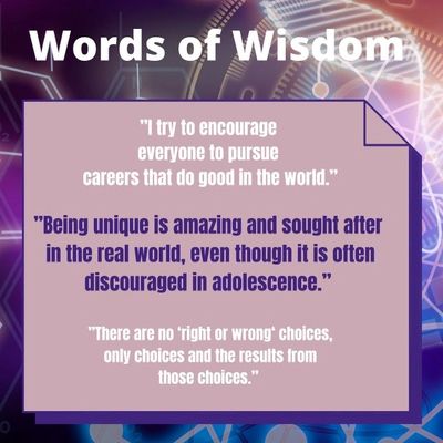 What advice do you have for girls that don’t feel smart enough: Challenge the idea of smart and enough… if someone seems naturally smart, it just typically means that they haven’t been challenged yet. Comparing yourself to others is a losing sport. You will always seem to run slow compared to a cheetah, but you run super fast compared to an ant...and at the end of the day does that matter. What matters is that you are trying to be better than you were tomorrow and the world is a better place for you being a part of it.